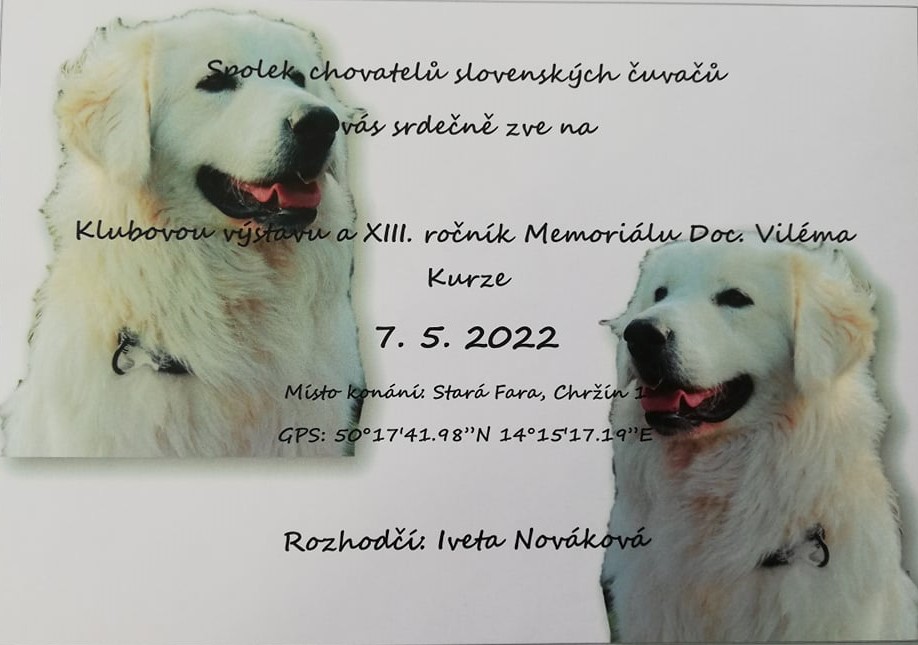 18.7.2025 Rádi bychom pozvali všechny příznivce slovenského čuvače dne 27. 9. 2025 na Klubovou výstavu a XVI. Ročník memoriálu DOC. Viléma Kurze + bonitaci. Rozhodčí: RNDr. Ingrid Mikulášová Přihlašování: Dog Office . Bonitace: rozhodčí a čas bude upřesněn, podle počtu bonitovaných jedinců!!! Uzávěrka přihlášek na výstavu i na bonitaci dne : 13. 9. 2025 Více info. viz propozice: zde